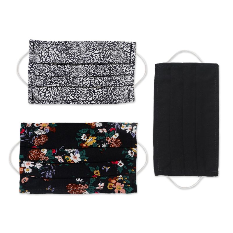 Midnight black hosts dreams in the darkness as Novica artisans craft a set of three cotton face masks — one in solid black, another in a leopard print and a third that hosts Victorian bouquets. The single-layer masks feature three pleats for comfort. They are washable and reusable, and have elastic to loop over the ears.