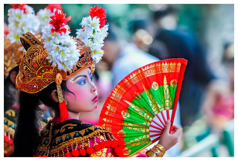 Balinese photographer Rudy Adnyana captures the graceful beauty of a Legong dancer as she incorporates the fan into her legendary choreography. Dressed in a golden costume, her ornate headdress includes fresh flowers. Legong dancers can be as young as four years old, and it is meant to be performed by two girls who have not yet reached puberty. The choreography includes complicated footwork, expressive gestures, intricate finger movements and powerful facial expressions.