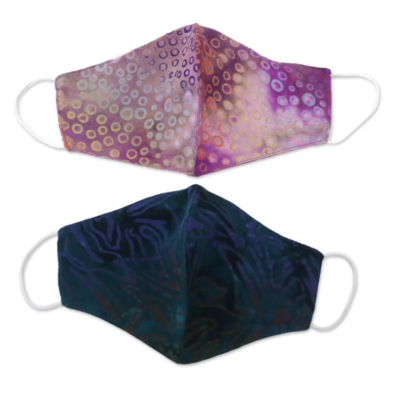 Galuh Kenanga designs a set of two contoured face masks for comfort and fit. Crafted of Bali's legendary hand-stamped batik, each one has two layers of fabric. Both are washable and reusable, and feature elastic to loop over the ears.