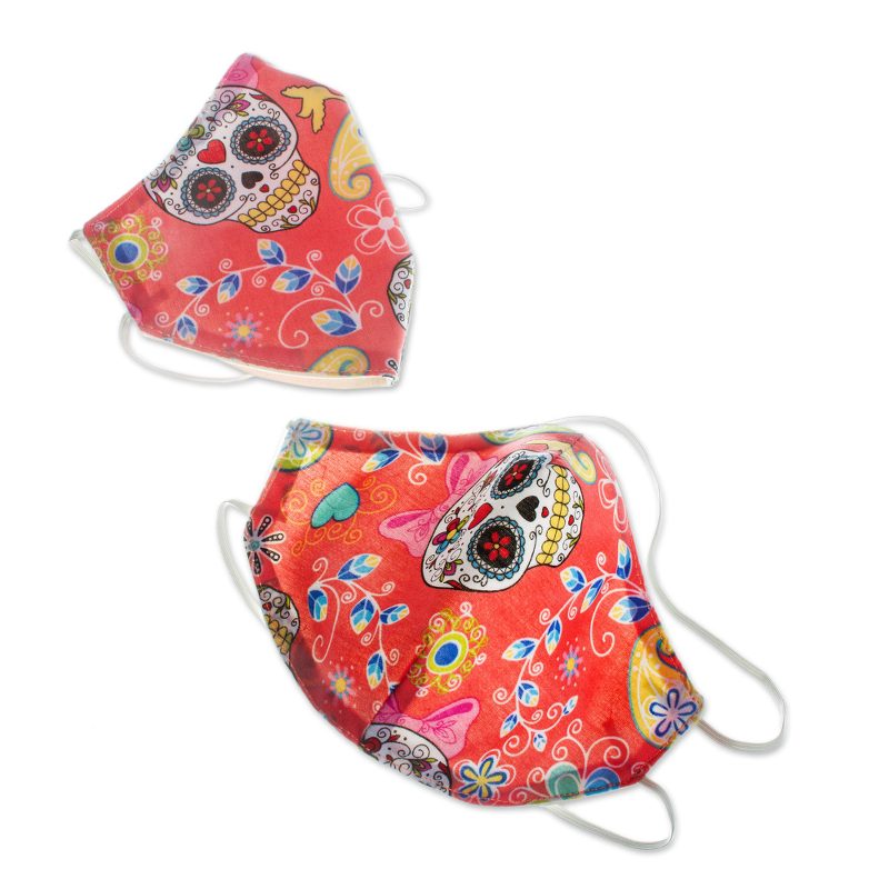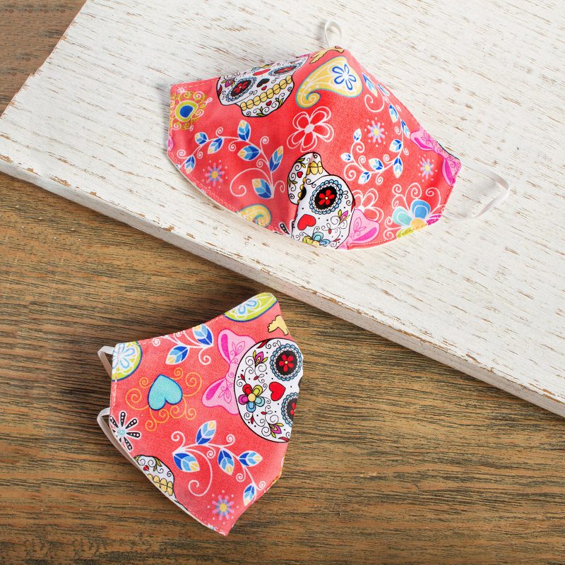 Floral skeletons wearing flirty bows grace these charming face masks by Maria Cristina Martinez. Crafted of a pink polyester print, they are lined in cotton, are washable and reusable, and feature elastic that stretches completely around the head.