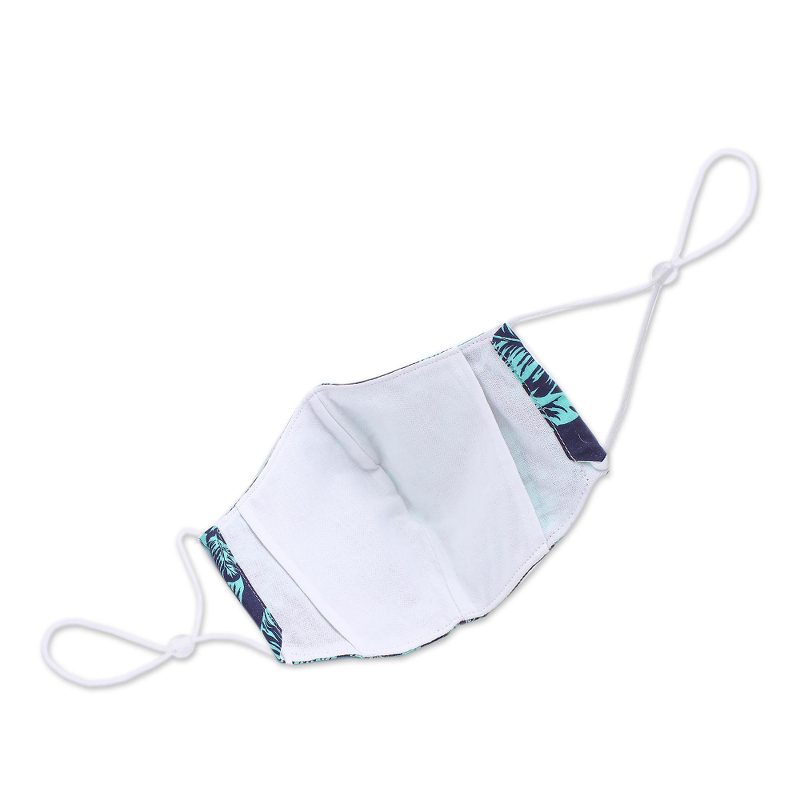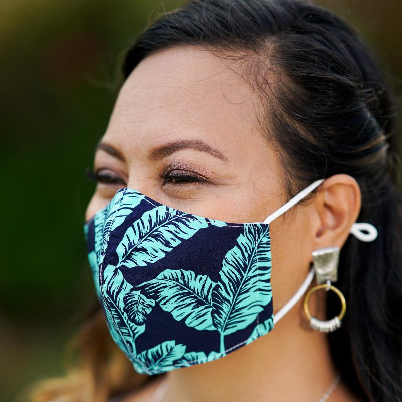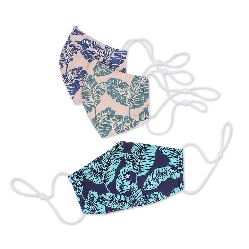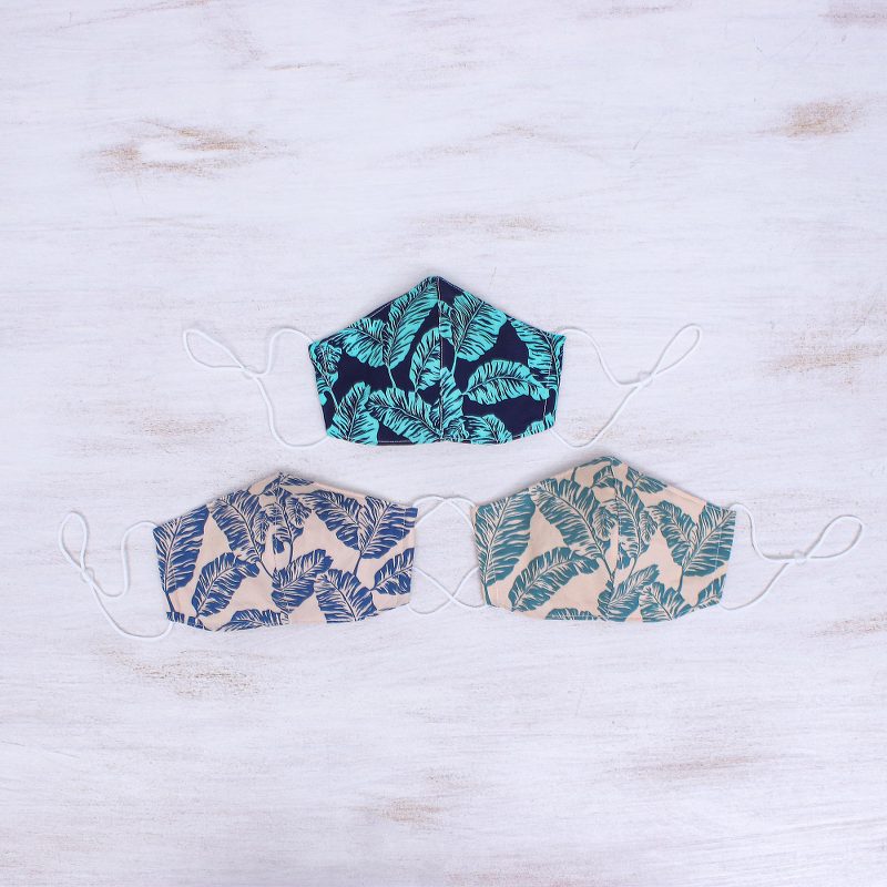 Banana leaves evoke the tropics in face masks by Russamee Thepphanakit. The blue-green foliage appears on beige, ivory and navy blue backgrounds. All three have three layers, one of which opens so a filter can be inserted. The contoured masks feature elastic loops to slip over the ears; their length can be adjusted with a silicone disc. All three are washable and reusable. Filter pad not included.