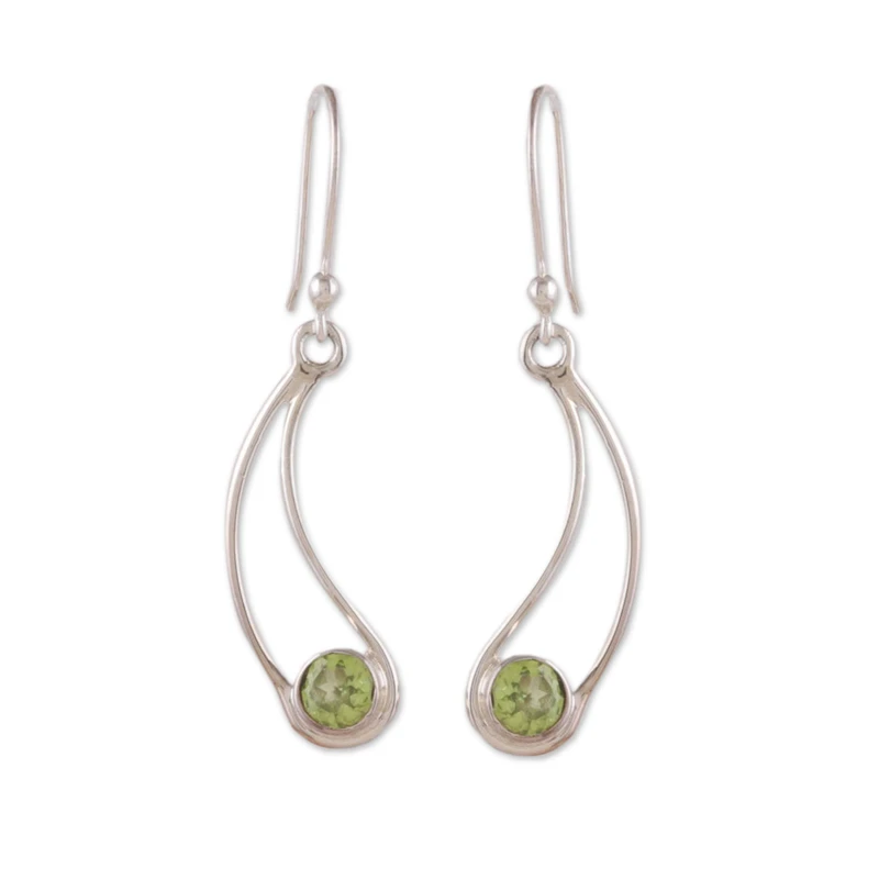 Drawing inspiration from abstract themes, these sterling silver dangle earrings shine with an avant-garde vibe. Directly from India, Narayannii's design has a high-polish finish that enriches the elegance of its sinuous structures, while natural peridot stones rest at the bottom, totaling one carat.