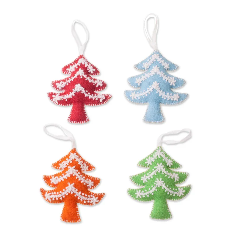 Decorated with white alpaca blend embroidery, four trees are handcrafted from wool in colors of crimson, tangerine, lime, and sky blue. Peru's Sumaq Qara Association presents these ornaments, which make a vibrant addition to any tree.