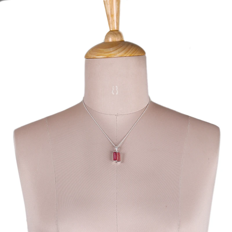 Explore the captivating colors living inside this pendant necklace by India's Neetu Barathi. Crafted following contemporary trends, the design transports you to a world in pink through sublime ruby and quartz jewels. Totaling over one carat, the gems rest on a sterling silver inlaid setting.