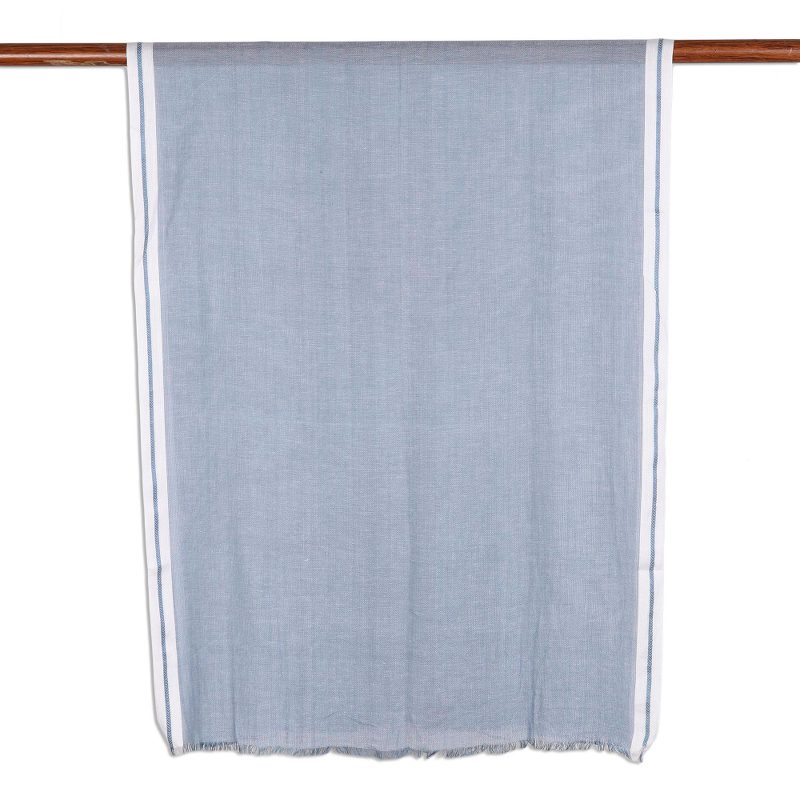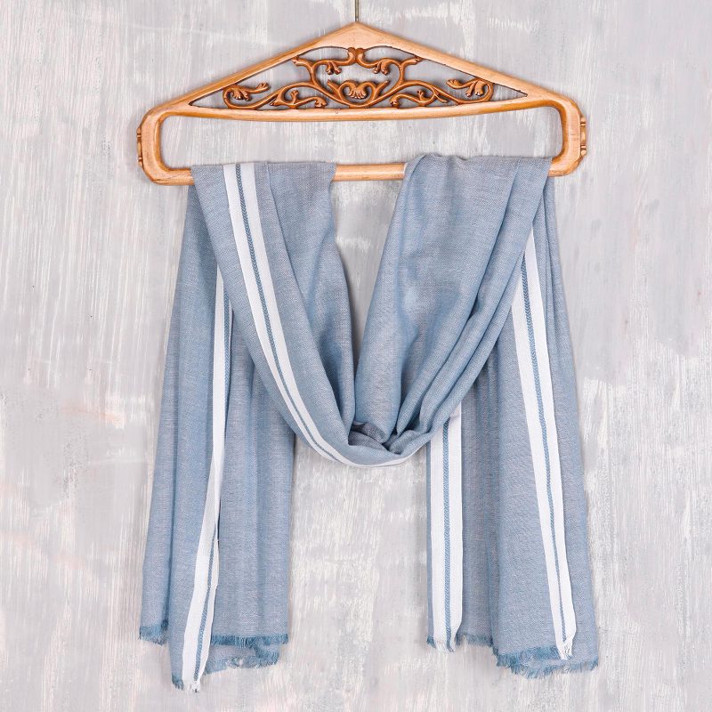 Weaving together viscose threads of cadet blue and snow white, Indian artisan Danish Ansari creates this beautiful shawl. A white border accentuates this bold accessory, which is decorated at the ends with petite fringes. The shawl's width allows it to double as a scarf.