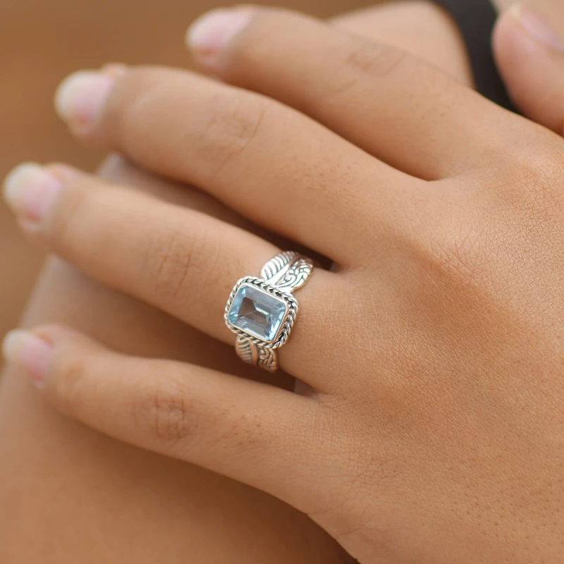 Backed by our 100% Happiness GuaranteeFlanked by sterling silver leaves, a proud, three-carat stone of faceted blue topaz crowns this Balinese creation from Kadek Wijanegara. The single stone ring is diligently handcrafted by local artisans, drawing inspiration from traditional motifs.