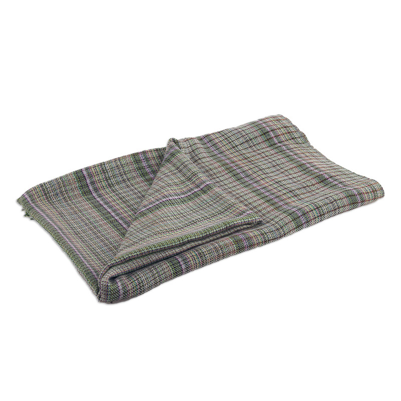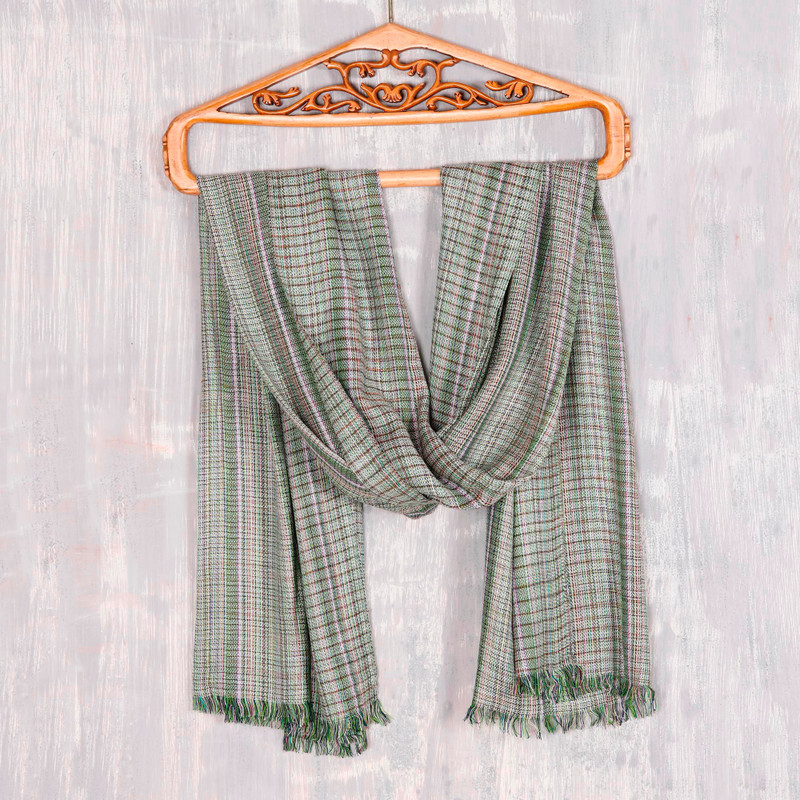 In a variety of colors, viscose threads are woven together to create this checked shawl that features a predominant green hue. Indian artisan Danish Ansari creates this fringed accessory, which can double as a scarf.
