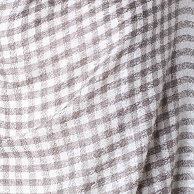 In grey over a creamy hue, this checkered shawl is designed to dress with modern elegance. India's Syed Hussein proudly presents this wool wrap with neatly trimmed edges.