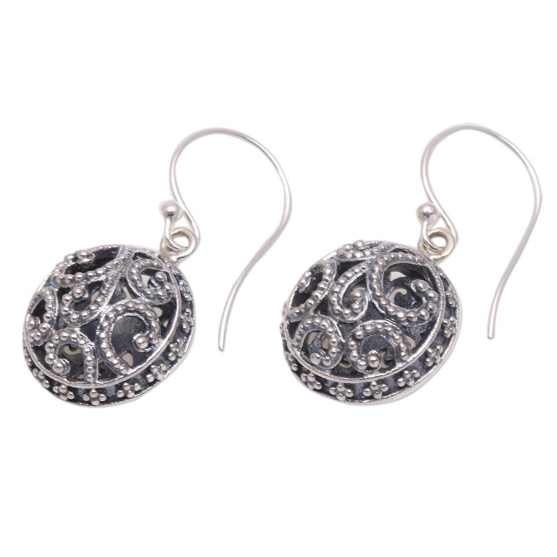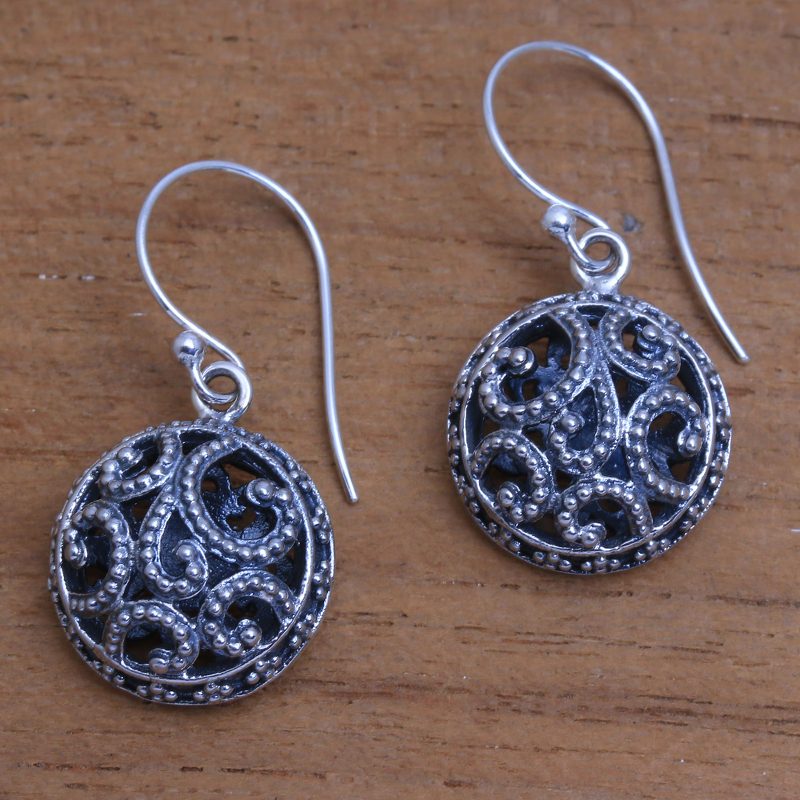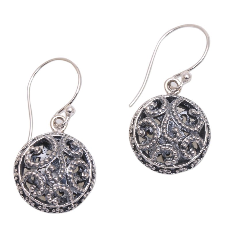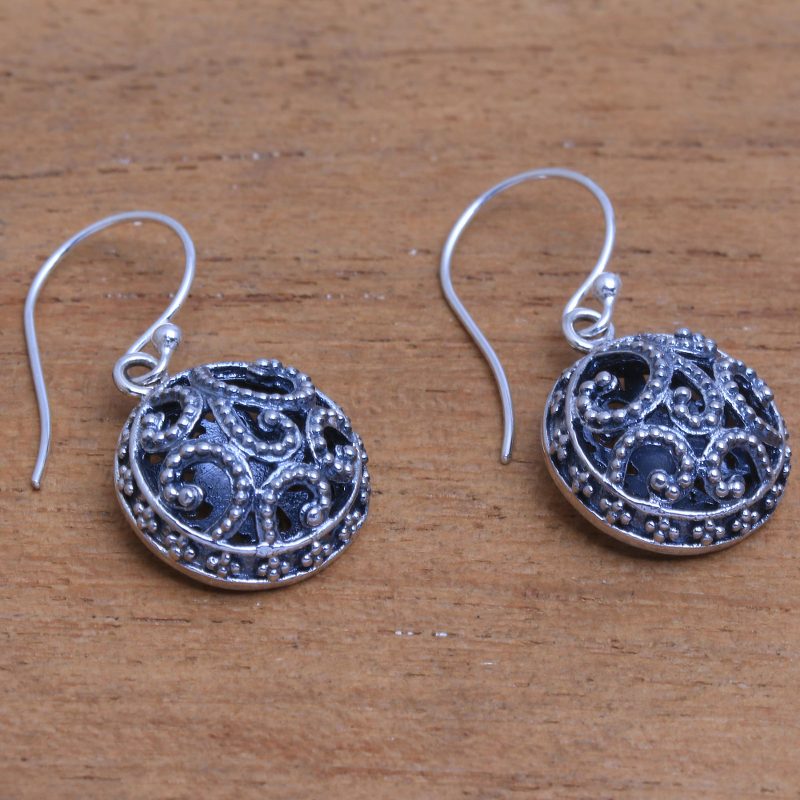 Resembling dew on the grass at morning, petite dots decorate this pair of handcrafted sterling silver dangle earrings from Bali. Putu Putri presents these disc-shaped earrings, which feature openwork patterns that reveal an oxidized interior.