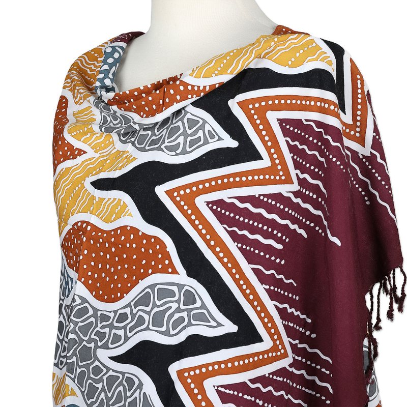Whether you choose to drape it around your neck or use it as a shawl or in any other creative way, this versatile rayon scarf is guaranteed to make you stand out. This must-have accessory dazzles with hand-drawn batik designs by Java's Erna Gendhis in contrasting colors and stylish patterns that create a stunning visual impact. With delicate fringe accents on both ends, the scarf has an exquisite color palette featuring mulberry, grey, amber, burnt orange, Caribbean blue, azure, white and black.
