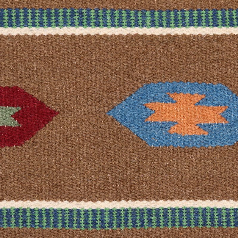 Evoking stars in the sky, colorful geometric patterns decorate the slate, tan and moss green stripes of this Indian area rug. Sonik Sethi presents the elegant rug, which is diligently handwoven from wool by local artisans.