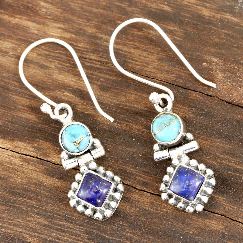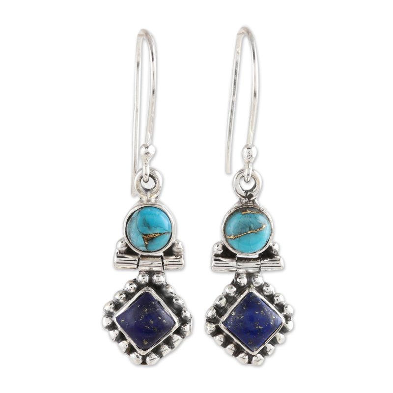 The splendid pairing of lapis lazuli and composite turquoise makes this pair of dangle earrings a must-have for lovers of gemstones. Presented by India's Shanker, each earring features a round cabochon of composite turquoise and a square cabochon of lapis lazuli. Crafted expertly by hand, the stones glisten in sterling silver bezel settings. The attractive design is completed with petite dots that encircle the lapis lazuli, highlighting its beauty.