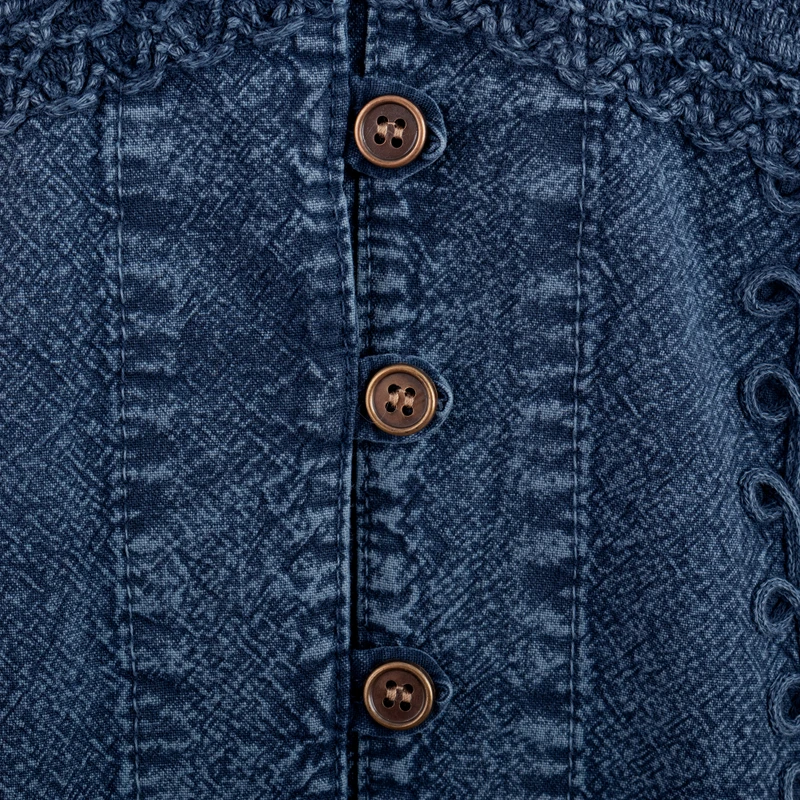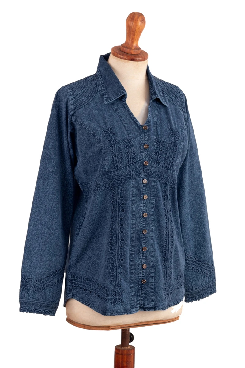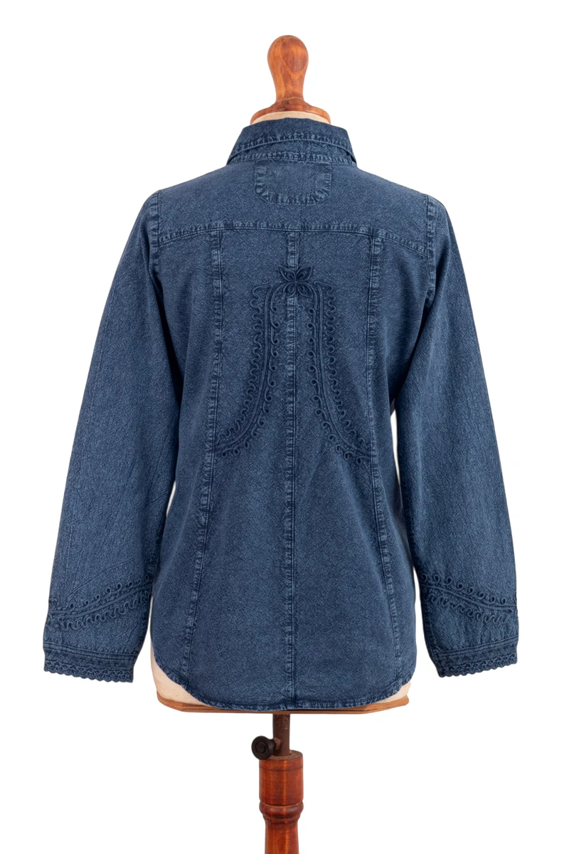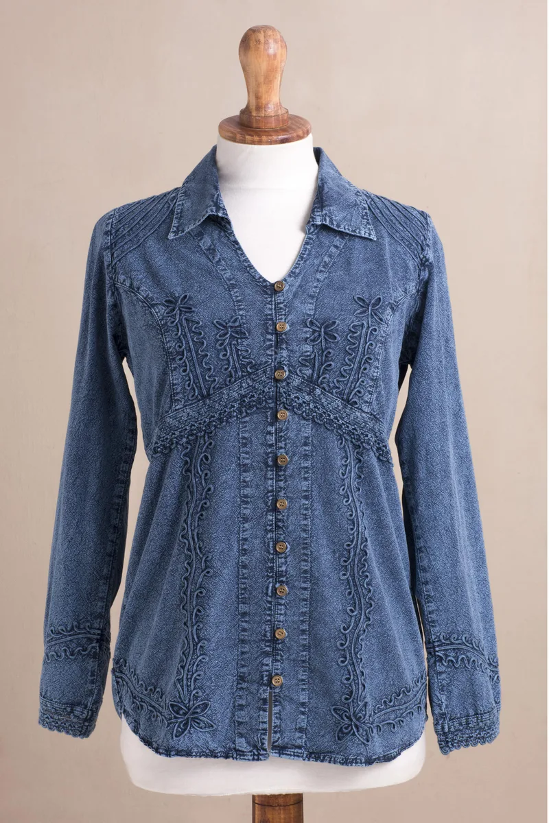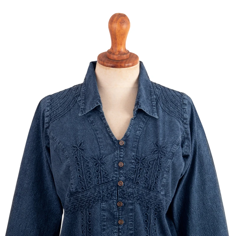 The colorful genus of flowers known as "lily of the Incas" was the inspiration for the hand-embroidered design of this organic cotton chambray blouse. Peruvian artisans hand-stitch a handful of petite flowers along with a wealth of soutache embroidery and crocheted lace details at the bust and cuffs. Button-and-loop closures and a V-neck collar make this blouse perfect for work or weekends.