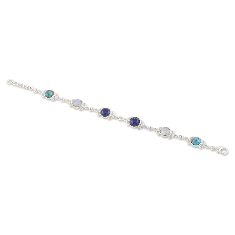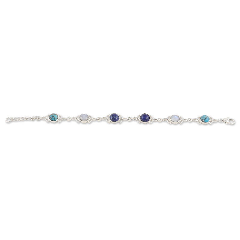 Magical energies add a bewitching touch to this sterling silver link bracelet, designed by Sapna Mehta from India. Crafted by local artisans, the accessory comes in a polished finish that enhances its precious stones, including lapis lazuli, rainbow moonstone and reconstituted turquoise jewels.