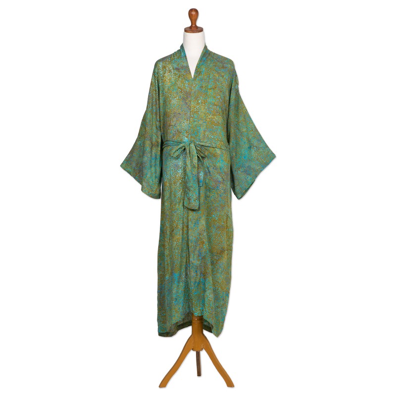 Step into unparalleled luxury with this exquisite rayon robe for men. Crafted using Bali's traditional batik technique, its hand-stamped patterns in sap green, turquoise and amber, reminiscent of lush greenery, transport you to paradise. The wide kimono sleeves, front-wrap styling and coordinating tie belt create a sophisticated yet relaxed silhouette perfect for lounging in refined comfort.