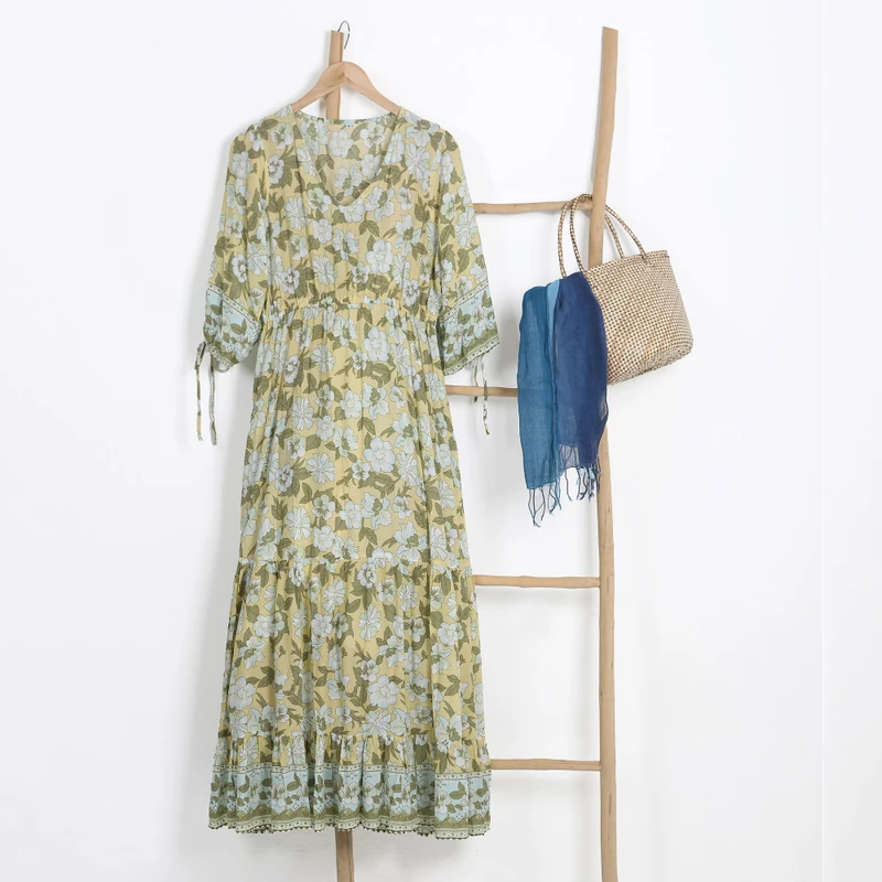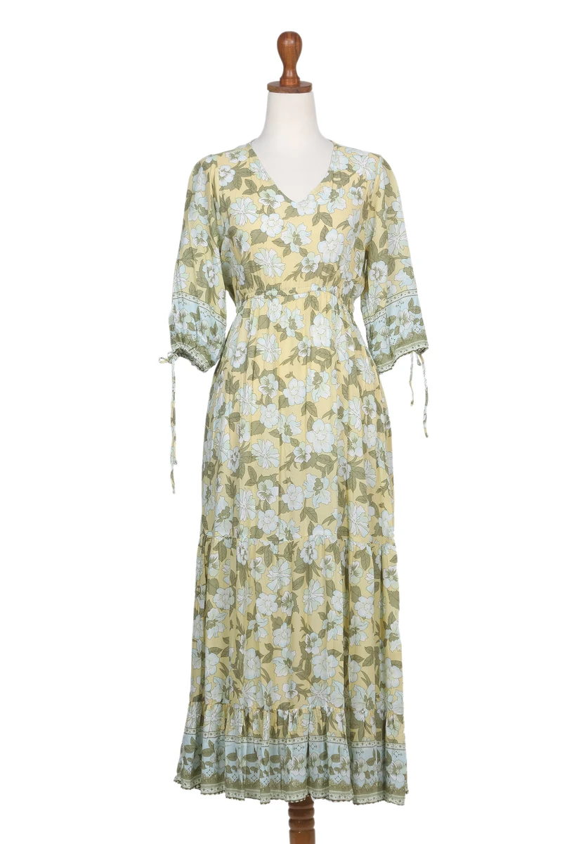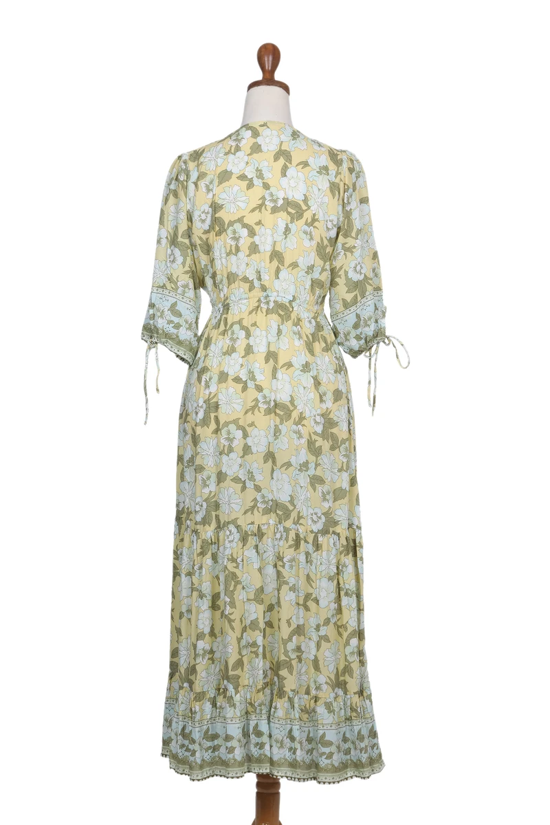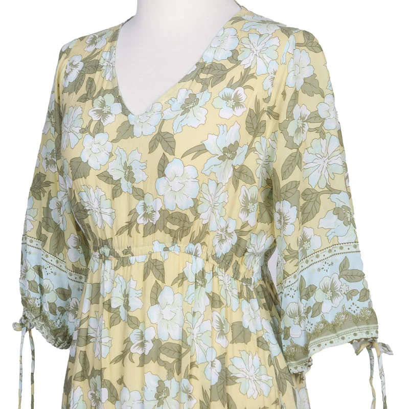 Backed by our 100% Happiness GuaranteeFlirty and flowy, this soft rayon maxi dress is the epitome of spring style. Mint flowers and olive leaves cover a goldenrod yellow base. Featuring an elastic high-waist design, v-neckline, adjustable tie three-quarter sleeves, ruffled hem and side seam pockets. The perfect dress for a day out, casual events or strolling the boardwalk.