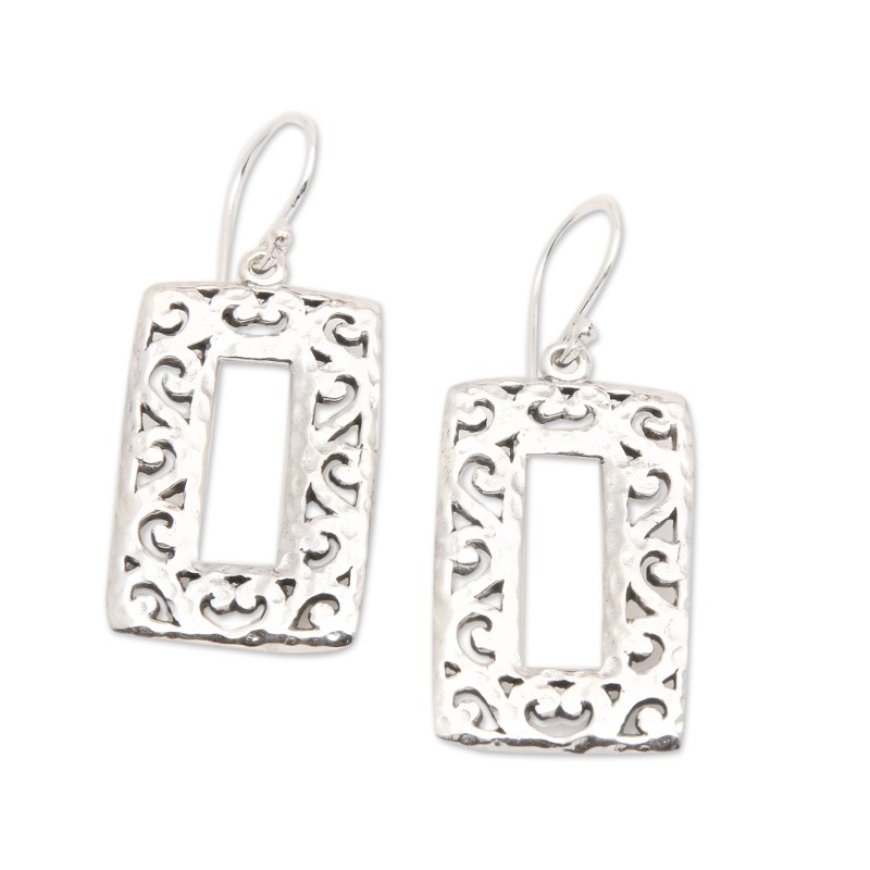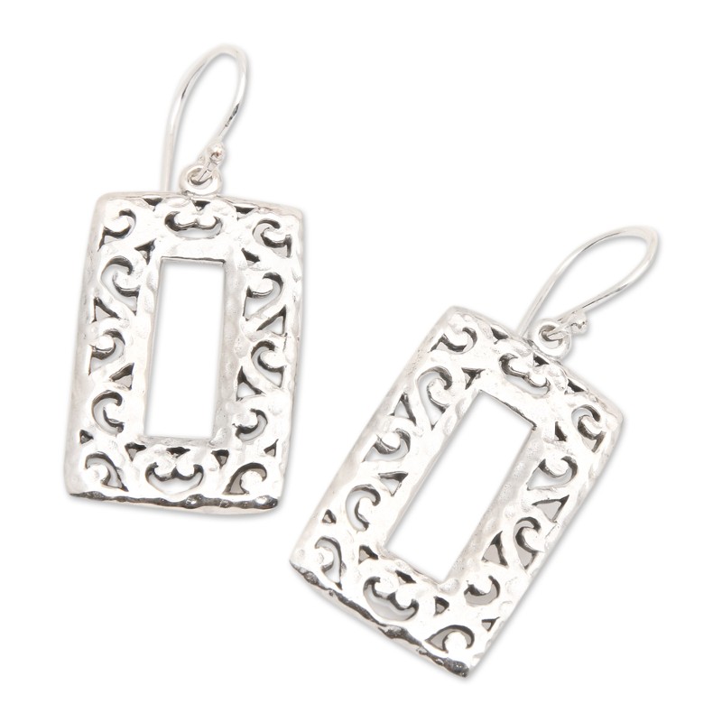 Balinese master silversmith Suar Dwipayana draws inspiration from antique frames for these breathtaking dangle earrings, sculpting swirling motifs and hammered textures into the rectangular sterling silver structures. With light delicately dancing across the intricate openwork, they exude effortless sophistication perfect for any ensemble and occasion.