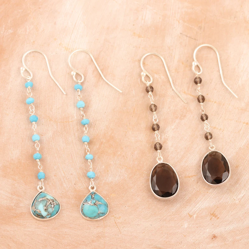 India's Neetu Barathi draws inspiration from jewels to design a set of two sterling silver dangle earrings. After working side by side with local artisans, the final result is these glamorous accessories in a high polish finish: one with composite turquoise stones and the other with smoky quartz gems that total twelve carats.
