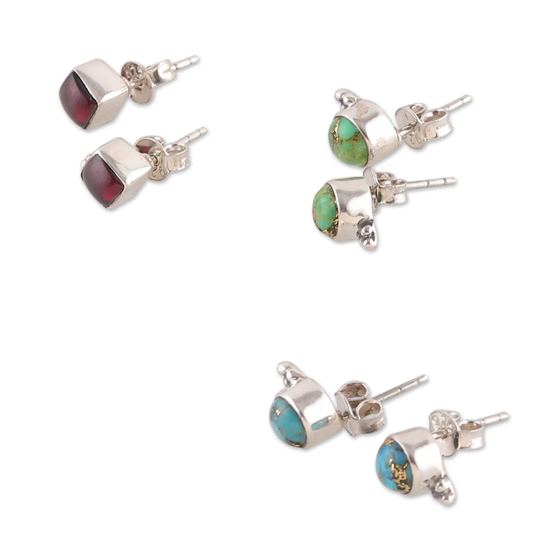 Conquer the day with spring's essence thanks to a sublime set from the Indian region. Narayannii presents these stud earrings, made with classic techniques to exude a sophisticated aura. The set includes three sterling silver pairs, each decorated with composite turquoise or garnet jewels to let your aura bloom as a primaveral garden.