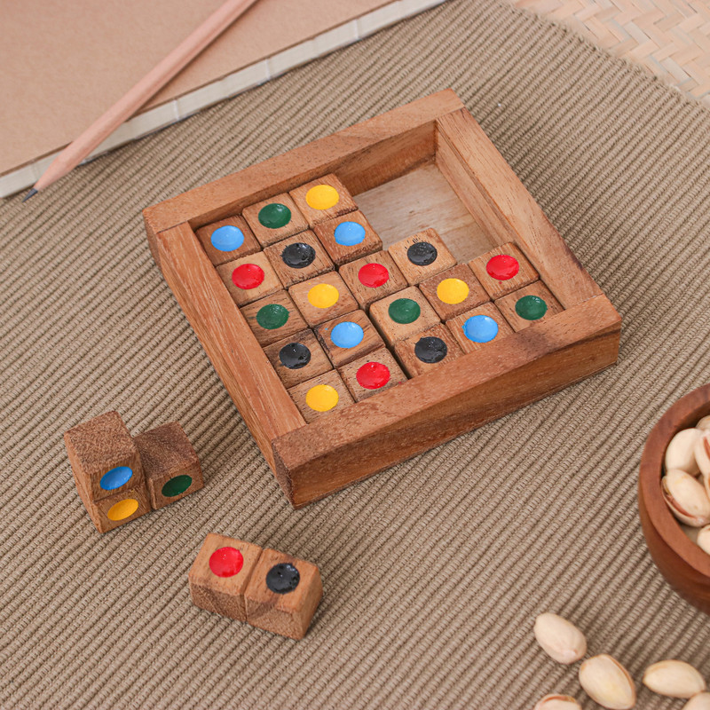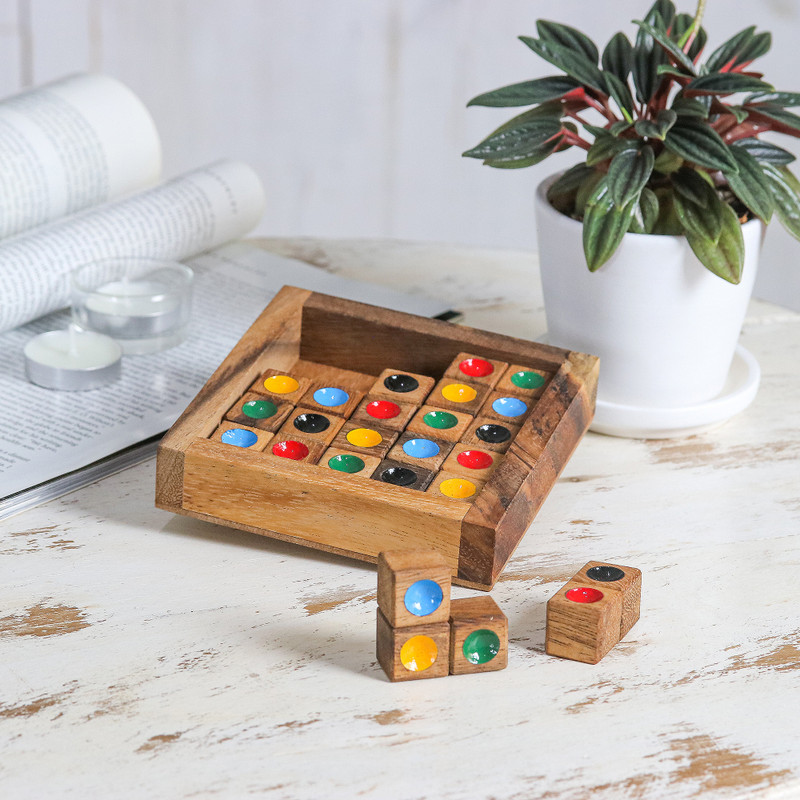 L and I-shaped pieces create a challenge for the most cunning minds out there! Thai artisan Waraporn Khamsuk draws inspiration from the classic sudoku game, changing the numbers for hand-painted colorful dots. The pieces come with a square board, all carved from raintree wood for a lustrous and elegant touch.
