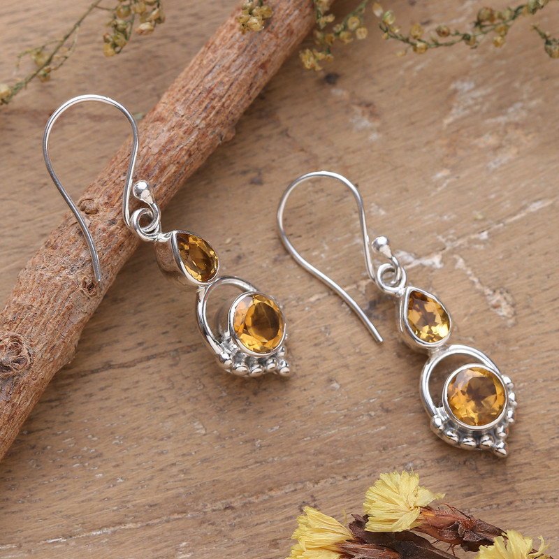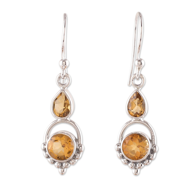 Master artisans from the magnificent Indian region reunite artistry and glamour in this graceful design presented by Narayannii. As inheritors of a long lineage of sublime jewelry arts, the artisans use sterling silver to create these dangle earrings in a classic style, crowned with citrine jewels whose yellow light symbolizes success. The jewels also total over two carats of glorious beauty.